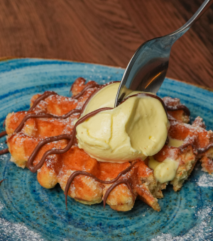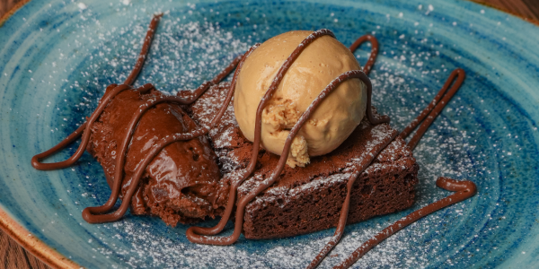 Bolo de Chocolate com núcleo cremoso de Caramelo e mini Gelado